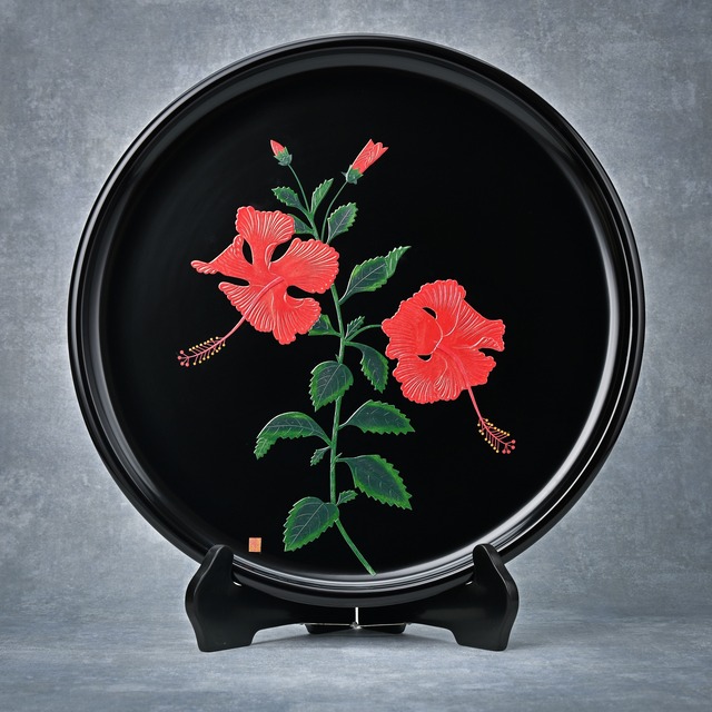 [商品説明] 漆器独特のしっとりとした艶があり上質感があります。 宮崎漆器の伝統的加飾技法である堆錦を施しました。 立体的で複雑な色彩美の絵柄をお楽しみください。 別途、盆立てを付属しております。 [寸 法] ∅ 390 mm × h 25 mm [重 さ] 約 1350 g [素 材] 天然木 [塗 り] 天然漆 [ 色 ] 表面黒:裏面黒 [デザイン] 堆錦 (ハイビスカス) [ 箱 ] 和紙貼り専用化粧箱 [生産地] 日本 宮崎 [堆錦とは] 琉球漆器における漆器の加飾技法の一つです。 十分に焼いて水分を飛ばした、くろめ漆に顔料を大量にを混ぜ合わせ、金槌等で何日もたたいて煉り合わせた「堆錦餅」と呼ばれる漆の塊をローラー等で薄くのばし、それに模様を付け切り抜き、色粉で着色や彫刻を施し漆器の表面に貼り付けたものです。 色鮮やかで立体的な絵柄を作ることができます。 ※天然木製品を手仕事で仕上げている為、漆器の表情・重さや大きさには多少の個体差がございます。 また、ご利用のブラウザやモニターの環境により、実際の色と多少異なることがある事をあらかじめご了承ください。 [お手入れ方法] 1.汚れた場合は柔らかいスポンジ等で洗い水気を取った後、乾いた布で拭き取ってください。長時間水につけておくことはお勧めできません。 2.食洗機、電子レンジ、オーブンでの使用はお避けください。 3.漆器は、なるべく紫外線や湿度の影響を受けにくい場所へ保管してください。変色や変形の原因になります。 4.冷蔵庫等に長期間入れておきますと乾燥しひび割れの原因になりますので、ご注意ください。 5.研磨剤、たわし等で洗うと傷つきますので使用しないでください。 6.汚れや指紋が気になる場合は、濡れた布で拭き取り、再度乾拭きしてください。 [宮崎漆器の歴史] 太平洋戦争末期に沖縄等の南西諸島から強制疎開によって宮崎に移り住んで来られた琉球漆器の職人の方々が、宮崎の地で漆器製作を行ったのが宮崎漆器の始まりです。 その後、漆器製作は社会福祉法人 宮崎県大島振興協会に引き継がれ、現在は社会福祉法人が運営する「宮崎漆器工房」として、身体に障がいのある方が漆器製作に携わる全国で唯一の漆器産地となっています。
